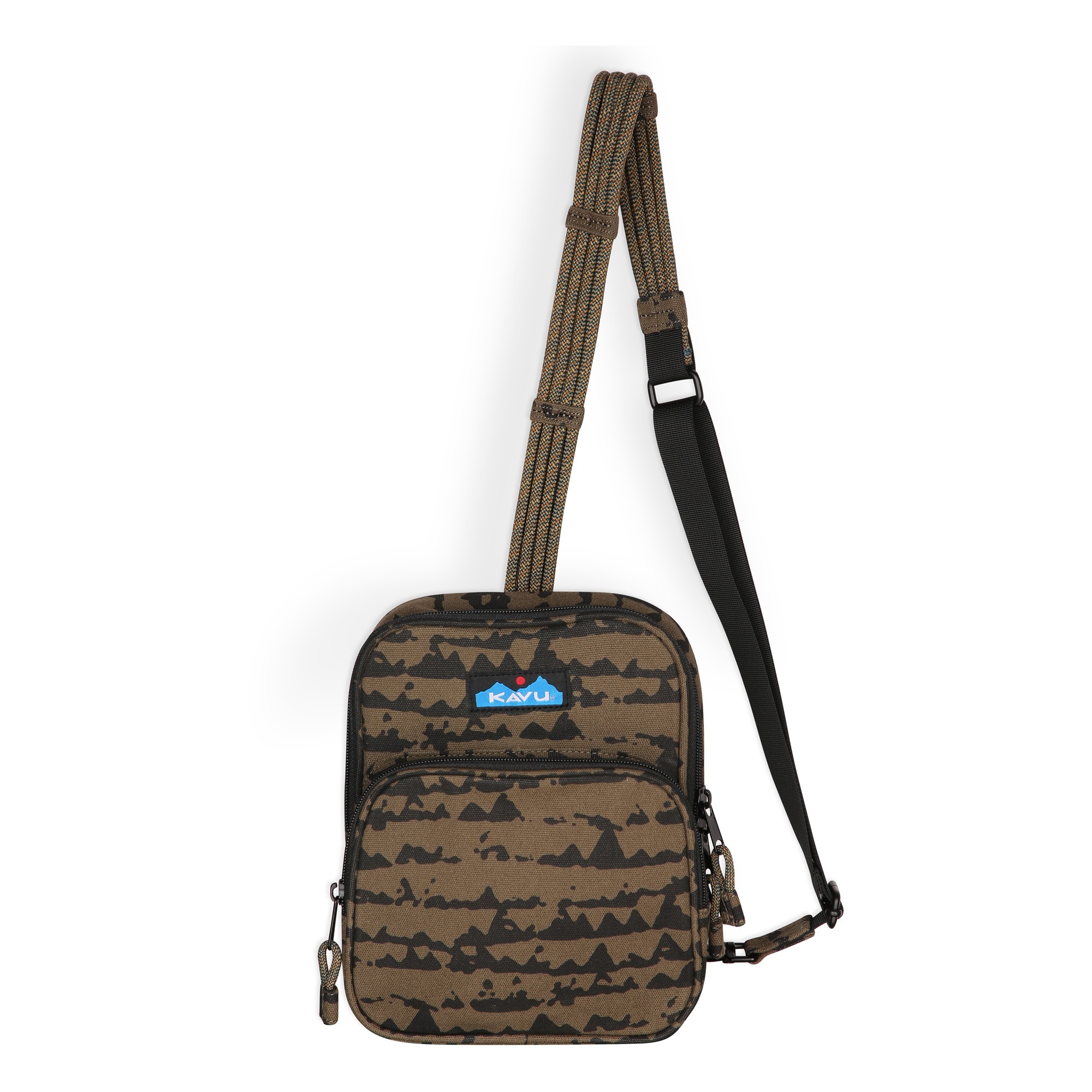 Semi padded mini sling pack, one adjustable webbing / rope shoulder strap with metal spring hook hardware that can switch to be worn on wearers right or left shoulder, main compartment with two-way zip closure, front zip pocket, one internal zip pocket, rope loop zip pulls.